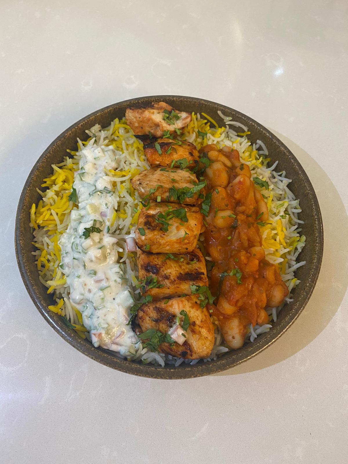 Chicken breast,Yogurt white Rice , Raita, sauce White beans with tomato sauce