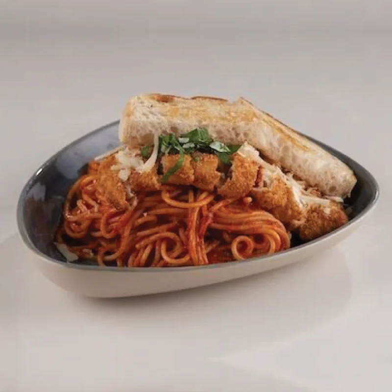 Spaghetti/Pomodoro sauce/ breaded chicken/ fresh basil