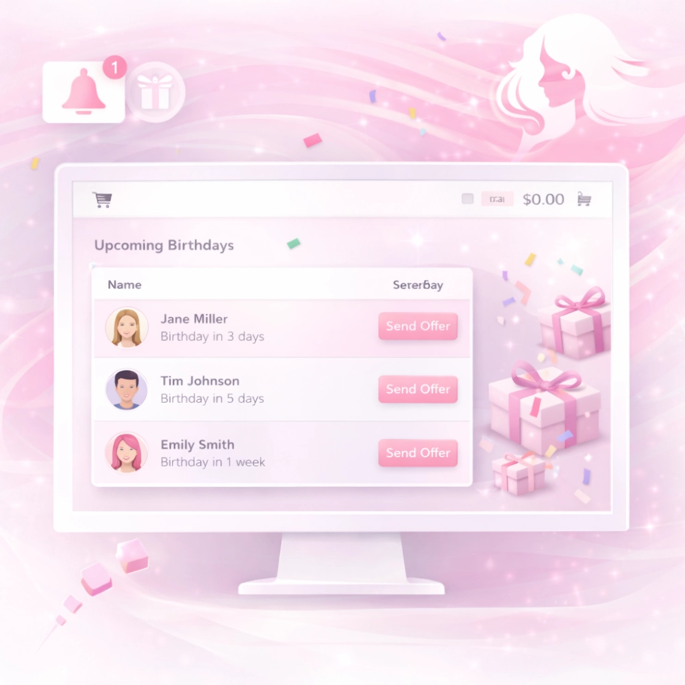 The system stores customer birth dates and automatically notifies staff when birthdays are approaching. Salons can then send: