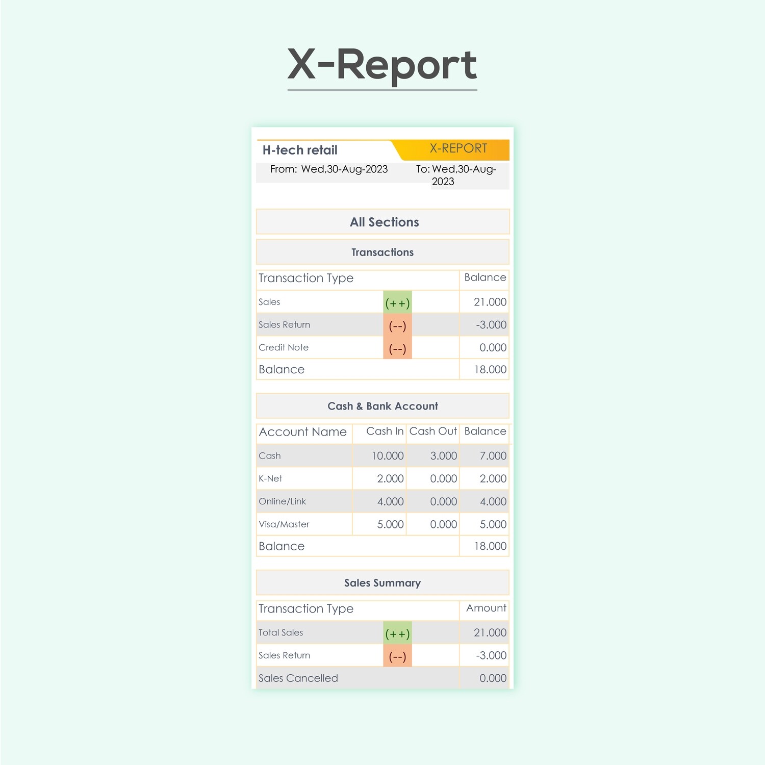 - Gain an overview of your cash account, bank account, and a comprehensive summary of your sales details.