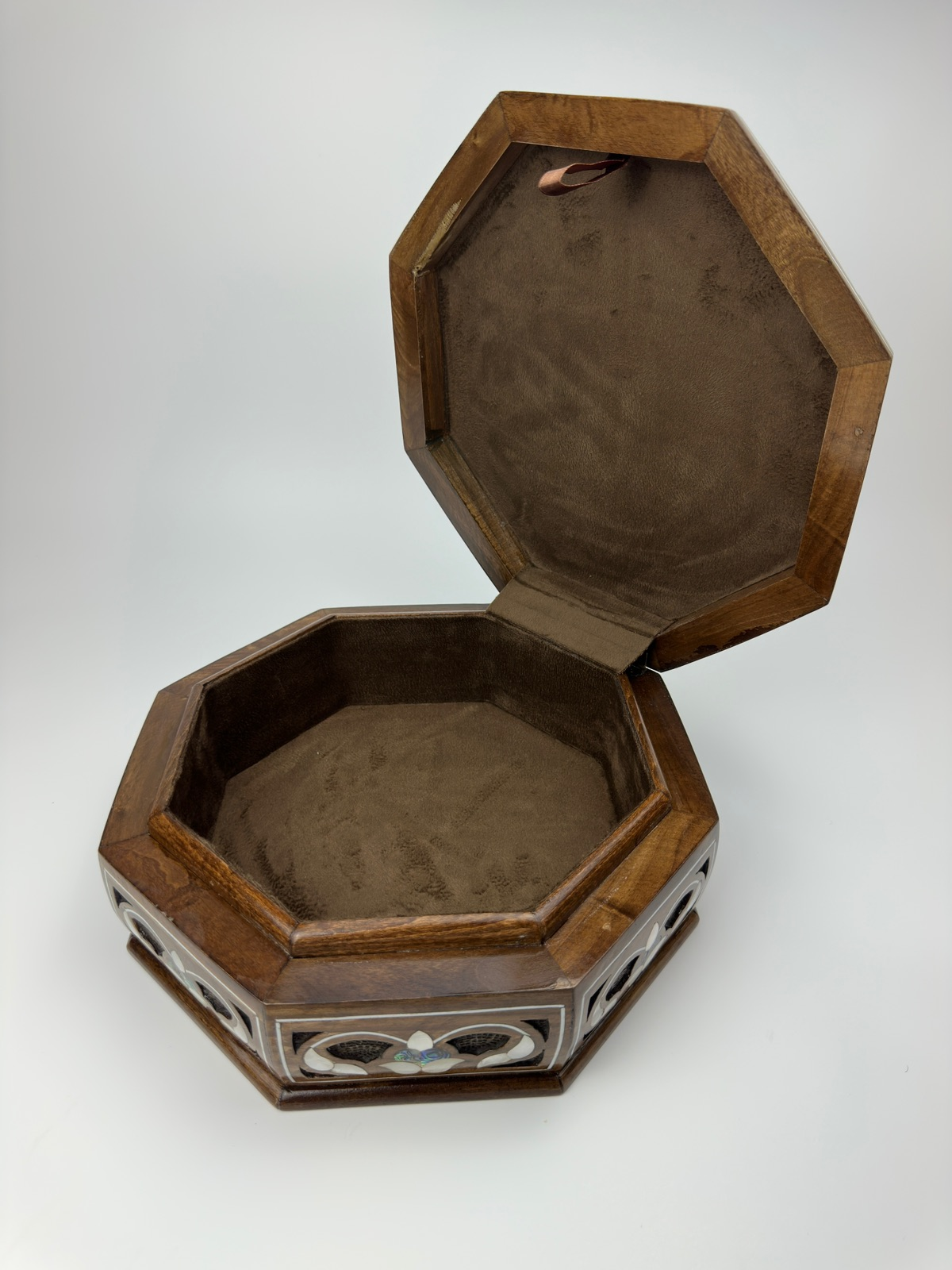 عمل يدوي متقن من خشب الجوز الطبيعي، مطعّم بالصدف البحري الأصيل المستخرج من سواحل البحر الأبيض المتوسط..