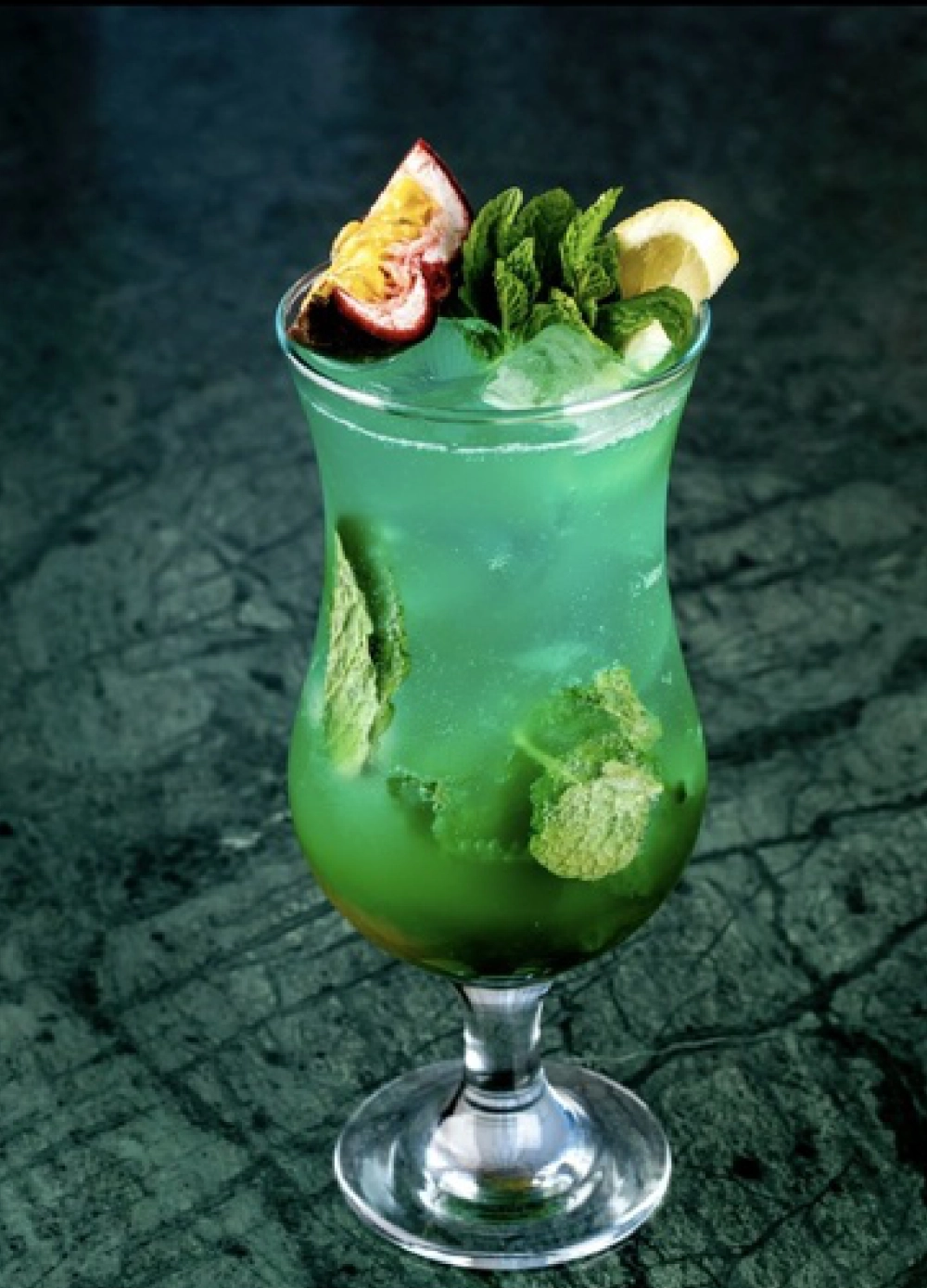 Passion Fruit Mix, Mint & Lime, Blue Zesty Orange Syrup, Leaves Of Mint, Soda Water